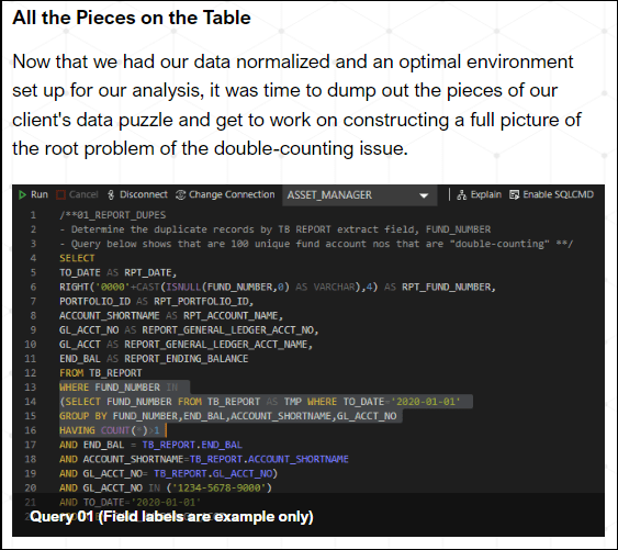 The daily records for the combined datasets reached into the multiple thousands, so we needed a robust analysis tool that would help us “reverse engineer” through all the data to uncover our client’s data mystery. The other major challenge that we had to overcome was how to take three separate sets of unnormalized legacy data and pore through it effectively and efficiently.